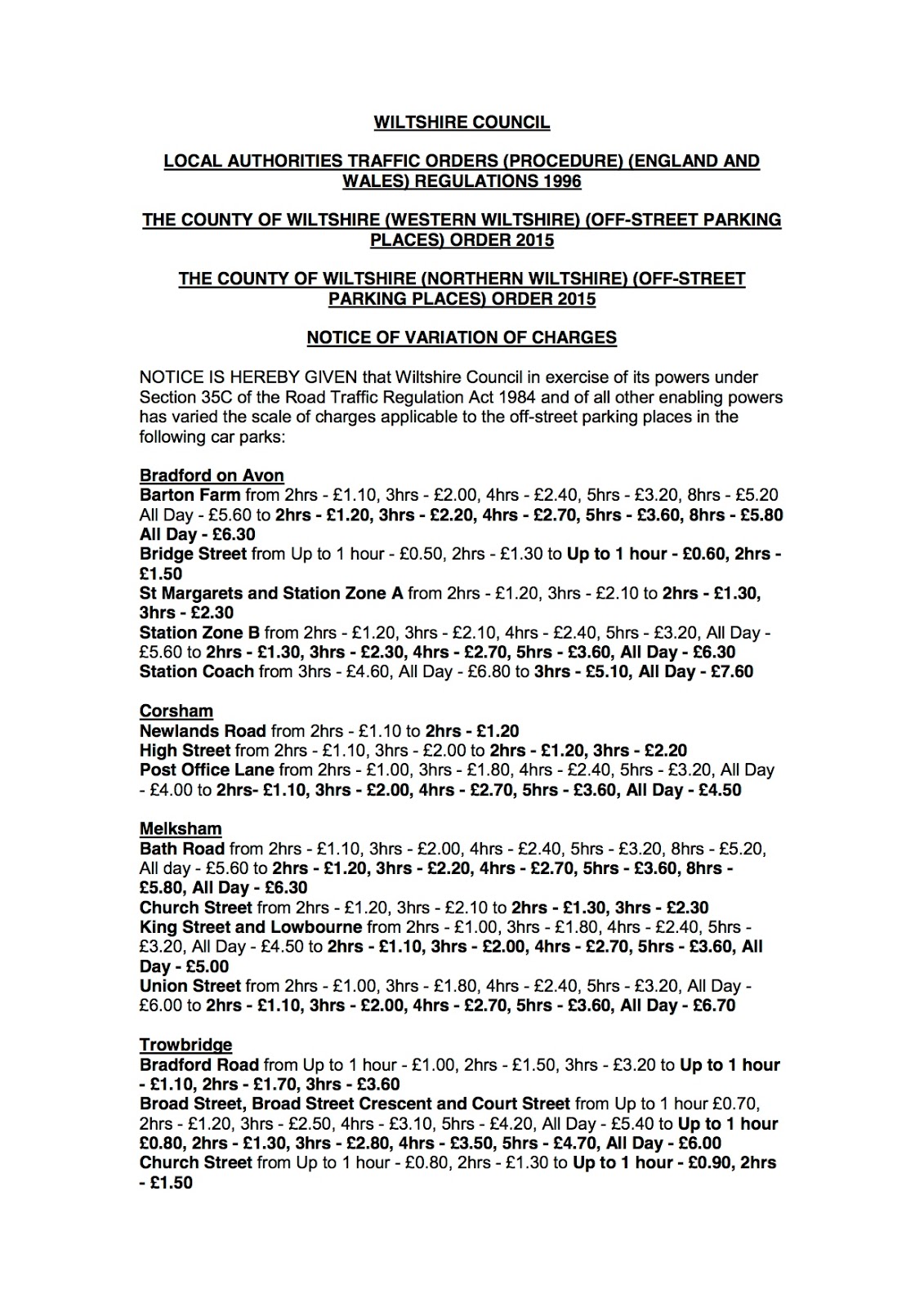 Variation Notice relating to the change in charges for off-street and on-street pay and display parking places within Bradford on Avon, Corsham, Melksham, Trowbridge and Westbury.